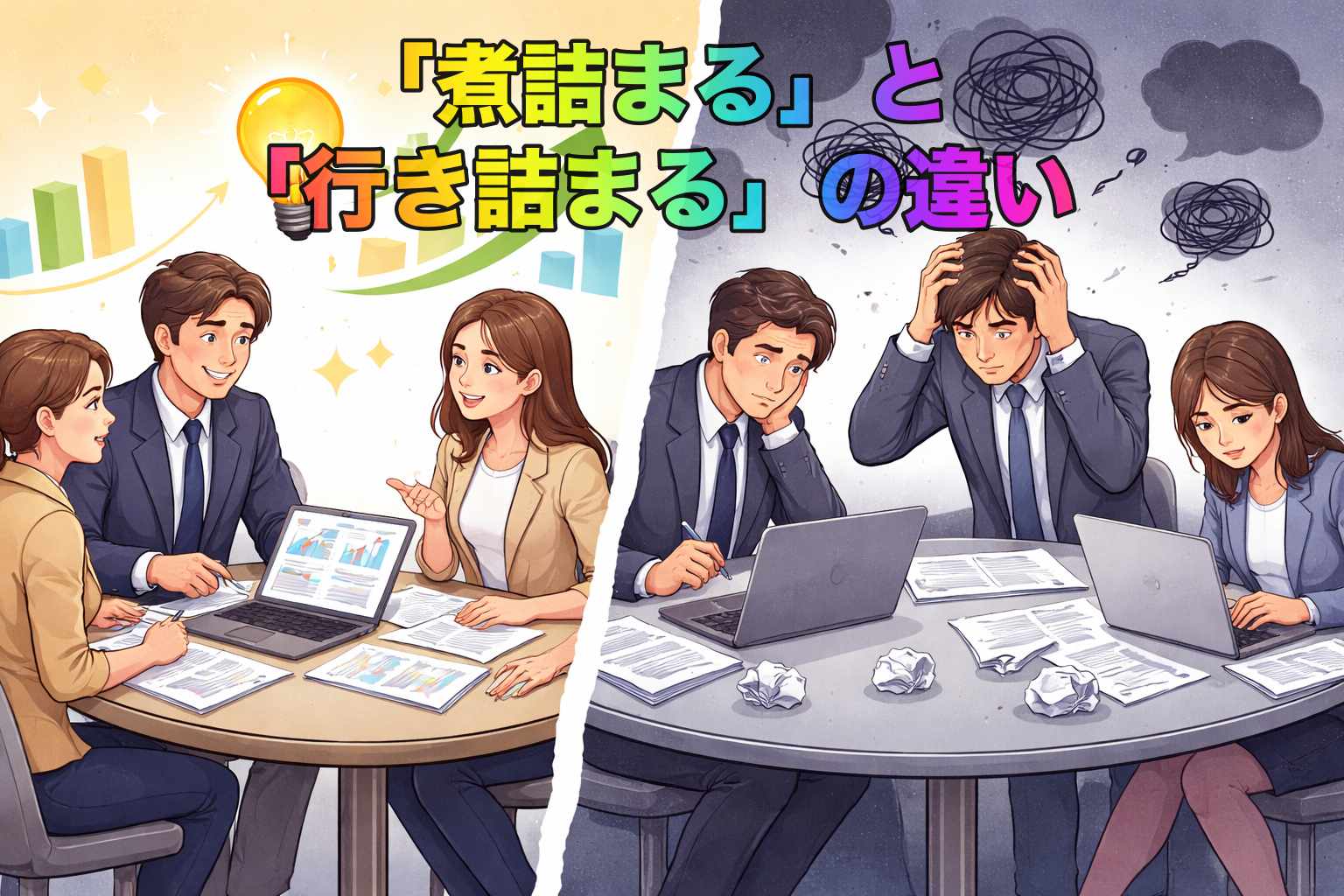 「煮詰まる」と「行き詰まる」は、どちらも日常やビジネスでよく使われる言葉ですが、意味は大きく異なります。