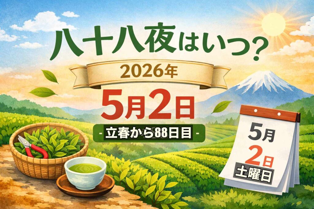 八十八夜は、立春から数えて88日目にあたる日のことです。 毎年同じ日だと思われやすいですが、実際には固定日ではありません。基準になる立春の日付が年ごとに少し変わるため、八十八夜の日付もわずかに動きます。 2026年の八十八夜は、5月2日です。 ちょ... -
