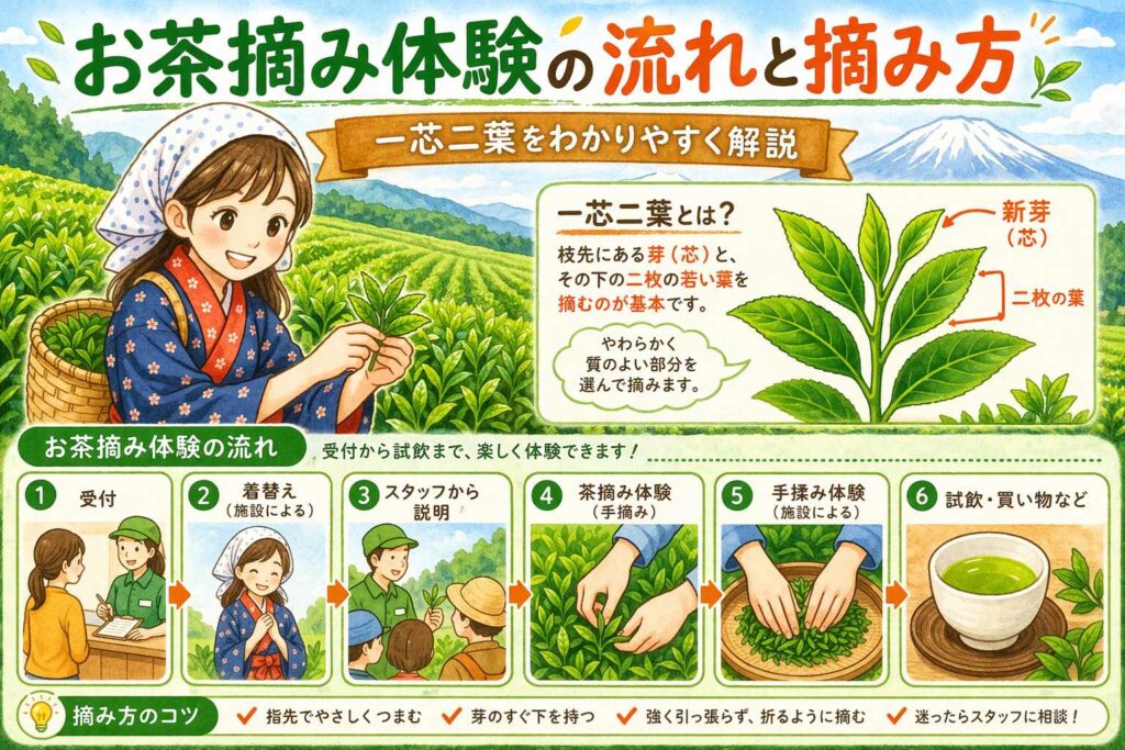 お茶摘み体験の流れと摘み方|一芯二葉をわかりやすく解説