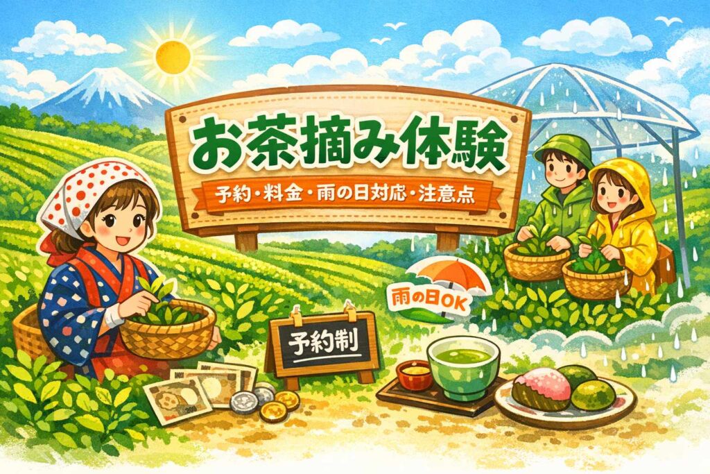 お茶摘み体験に行ってみたいと思っても、【予約は必要なのか】、【料金はどれくらいかかるのか】、【雨の日でも参加できるのか】が分からず迷う人は多いです。 特に春から初夏にかけてのお茶摘み体験は、【期間限定】で開催されるものが多く、思い立って当... -