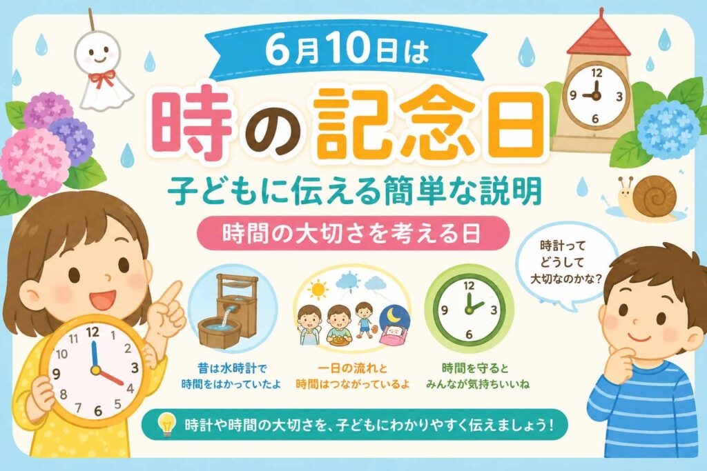 6月10日は「時の記念日」です。 子どもに伝えるときは、難しい歴史の説明から入るよりも、 「時計や時間の大切さを考える日だよ」 と話すとわかりやすいです。 時の記念日は、昔の日本で水時計を使って時を知らせたことに由来する記念日です。 現在では、... -